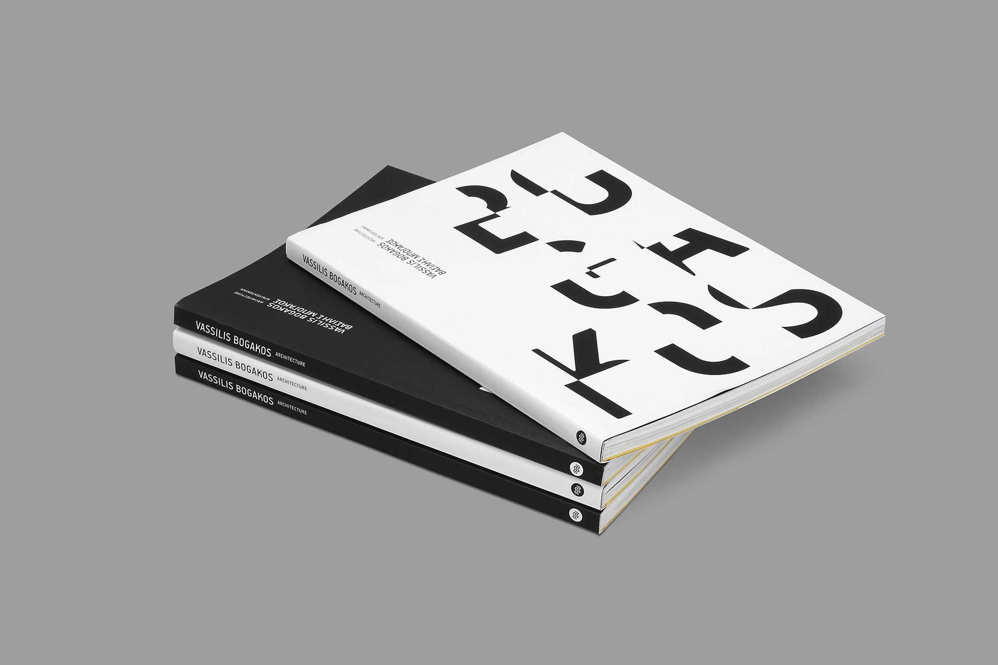 Since 1956, V. Bogakos has distinguished himself for his architecture as well as his design work. Inspired by the latter, the cover was designed as a fragmented version of the architect’s surname, homage to his 1970 ceramic tile designs. Yellow has been selectively used and juxtaposed to the book’s predominantly black and white design, as a reference to the architect’s colour palette.